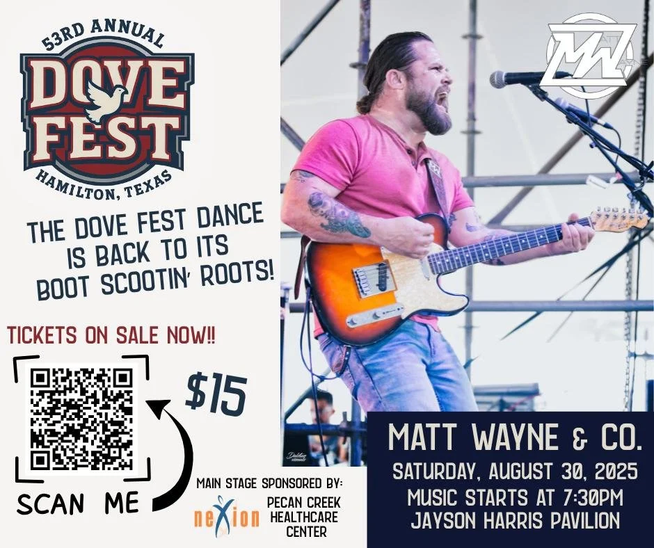 Join us for a boot scootin’ good time as we wrap up the 53rd Annual Hamilton County Dove Festival with a night of live music, dancing, and Texas-style celebration!