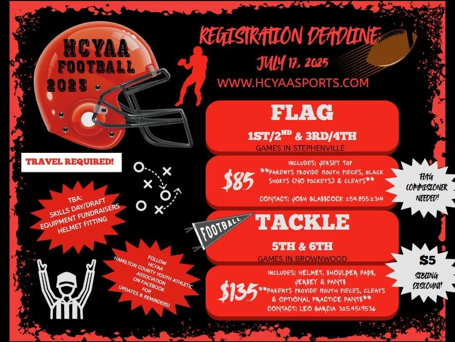 2025 Football & Cheer Registrations are open until July 17th! Click the link to get signed up! https://www.hcyaasports.com/registration