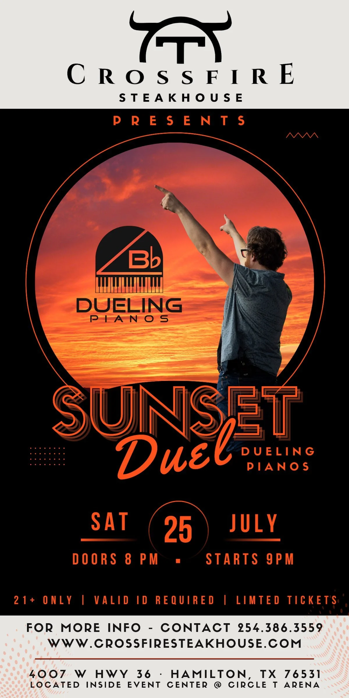 Prepare for an evening of music, comedy, and crowd interaction as B Flat Dueling Pianos takes over the stage at Crossfire Steakhouse. Renowned as Texas’ premier traveling dueling piano show, this high-energy performance promises non-stop entertainment, sing-alongs, and plenty of laughs.