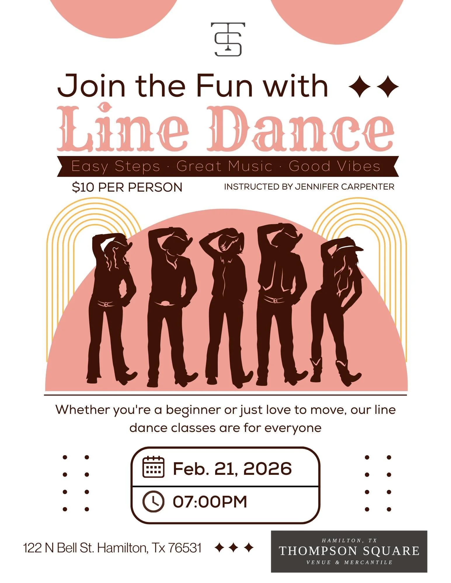 Ready to kick up your heels and try something new? Join us at Thompson Square Venue & Mercantile for a fun, high-energy Line Dance Night that’s perfect for everyone — whether you’ve never danced a step or just love a good reason to move.