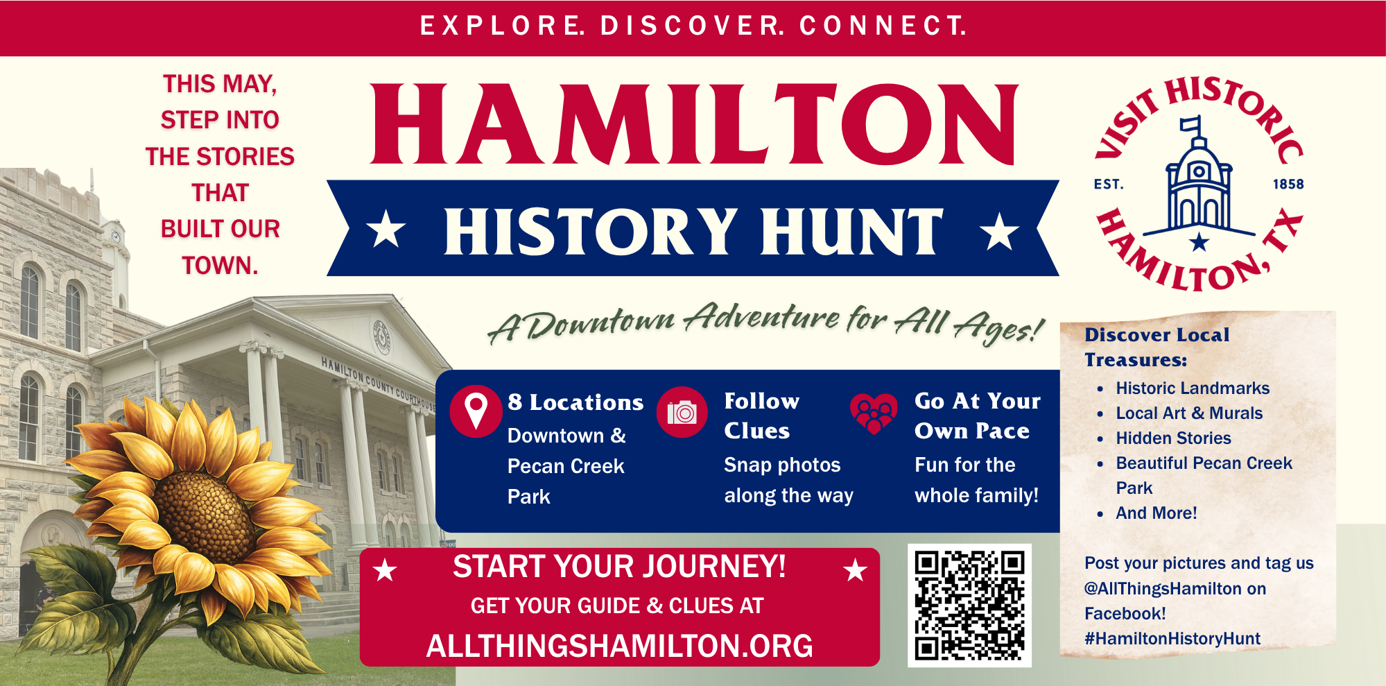 Throughout May, residents and visitors can enjoy a self-guided adventure across downtown Hamilton and Pecan Creek Park. Follow creative clues, discover historic landmarks, learn the stories behind them, and make memories along the way!