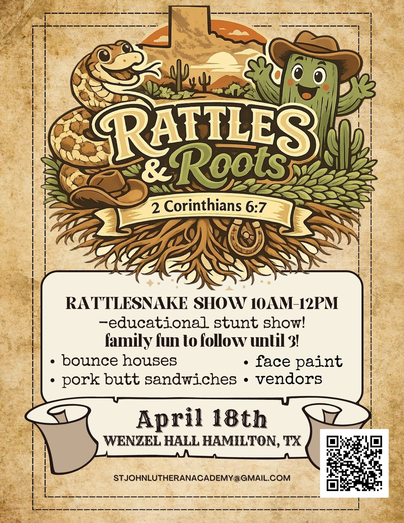 Rattles & Roots is a one-of-a-kind Earth Day celebration for the whole family! The Heart of Texas Snake Handlers will bring an educational (and entertaining!) rattlesnake show — with more rattlesnakes than you’d ever want to find in your driveway. Plus, enjoy petting zoos, carnival games, pulled pork sandwiches, music, and more. Come spend the day with us — all proceeds support St. John Lutheran Academy!