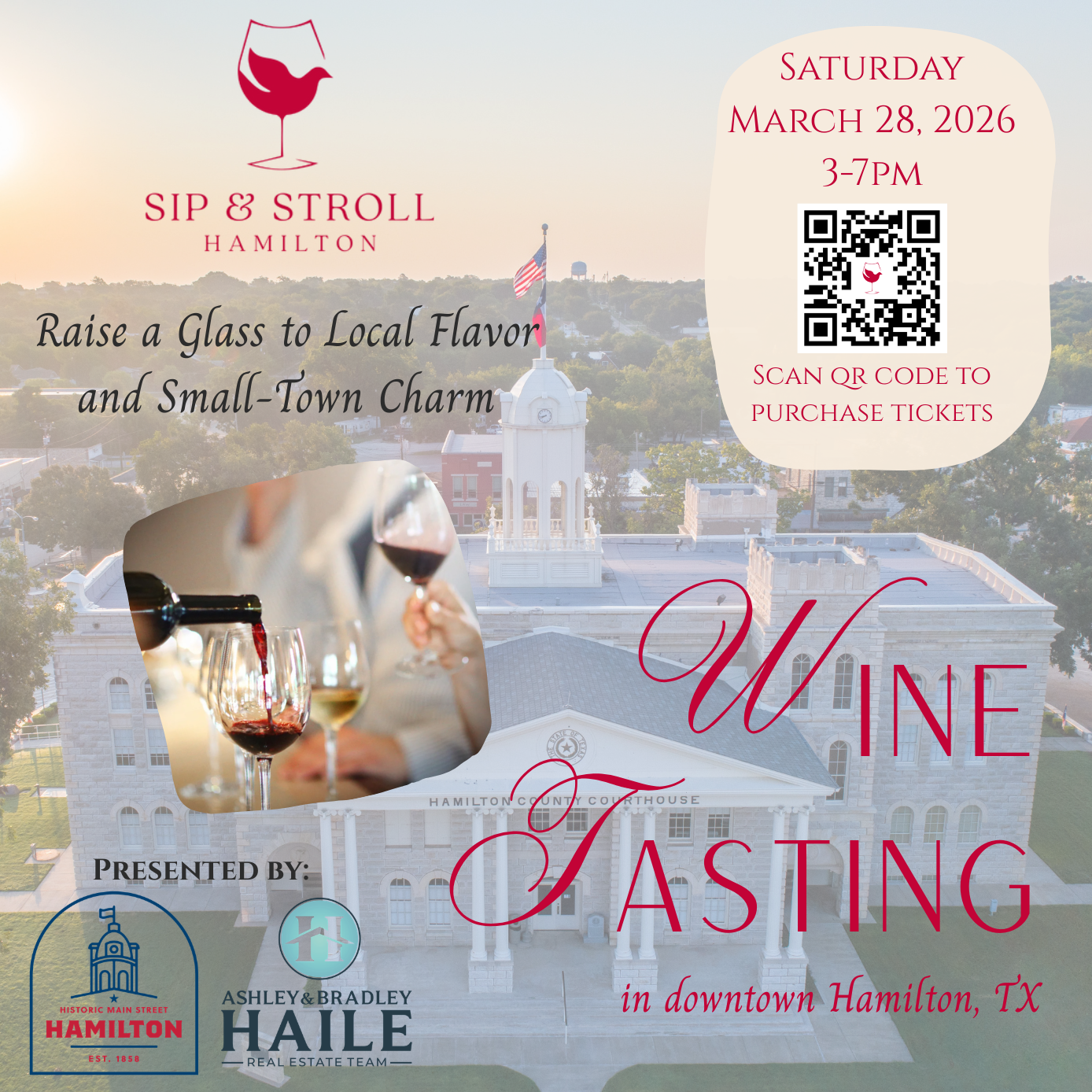 Something big is coming to Hamilton! Save the Date for our first annual wine walk in downtown Hamilton, TX. Make plans to join us for Sip & Stroll on Saturday, March 28th from 3pm-7pm. Stroll through the storefronts and shops in the Historic Hamilton Main Street district while sipping on wine provided by nearby wineries!